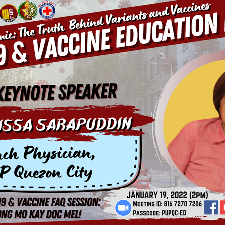 This three-day campaign, which was initiated by PUPQC-SSC in collaboration with the COL, Vox Nova, RCY, CHRS, and KATAGA, aims to spread knowledge about COVID-19 and the vaccine among students and individuals outside of the university as COVID-19 cases continue to rise at the beginning of 2022. The event was broadcast live on Facebook and the Zoom Platform from January 17 to 19, 2022.